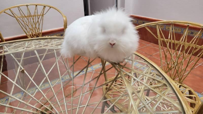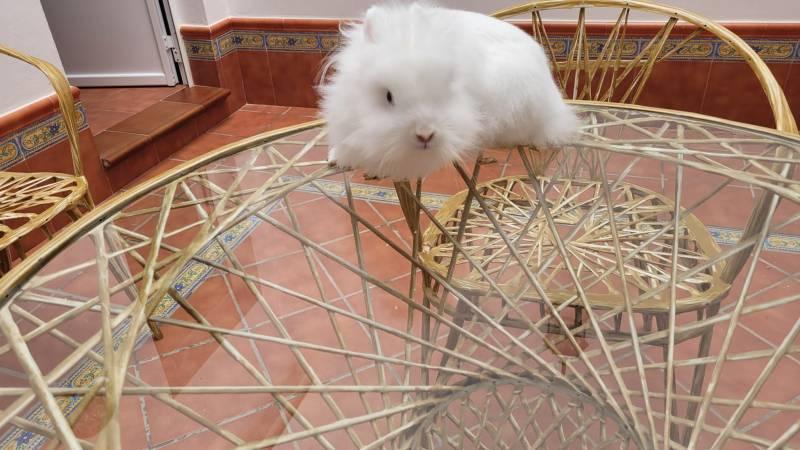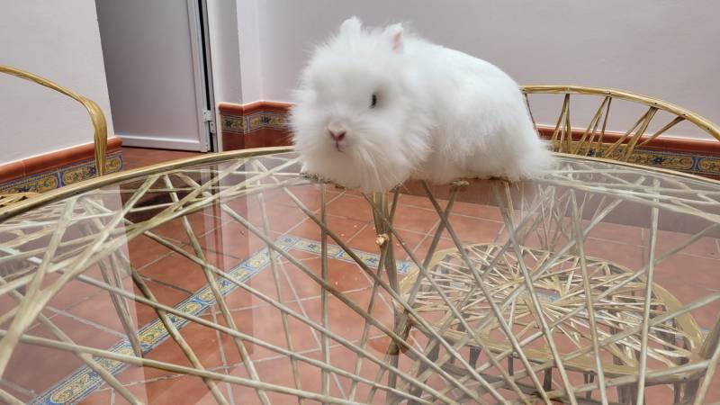 Conejo blanco con año y medio, puede que tenga mas años. Lo damos de regalo. Además de la jaula y demas adsesorios.