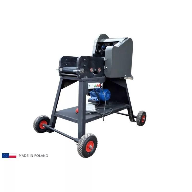 La máquina está dotada de dos bandas de 300 mm de anchura que, de modo fiable, prensan el material introducido. La banda transportadora está instalada a lo largo de toda la máquina, por tanto, no es necesario empujar el material manualmente. Para accionar las bandas sirven ruedas dentadas de alta calidad (por la falta de la cadena se mantiene la fuerza constante de presión).